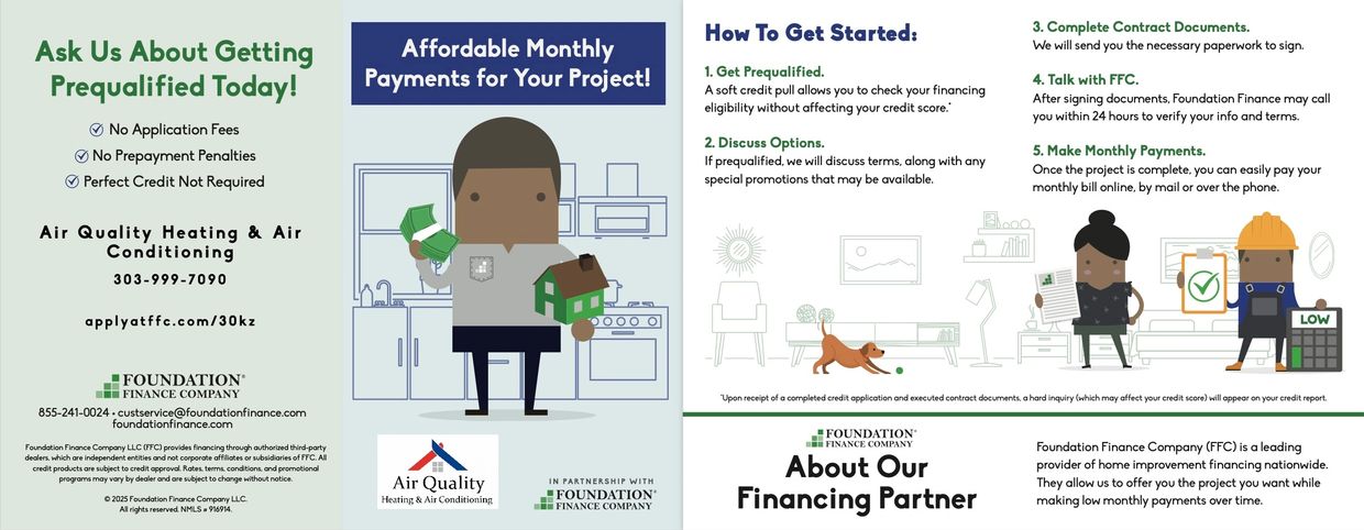 Do you have a home improvement project you’ve been saving up for? We are proud to offer low monthly payments so you can stop putting off that dream improvement or much-needed repair! Now’s the right time to upgrade your home. Contact us at 303-999-7090 to discuss your home improvement needs and how Air Quality Heating & Air Conditioning can make them a reality.